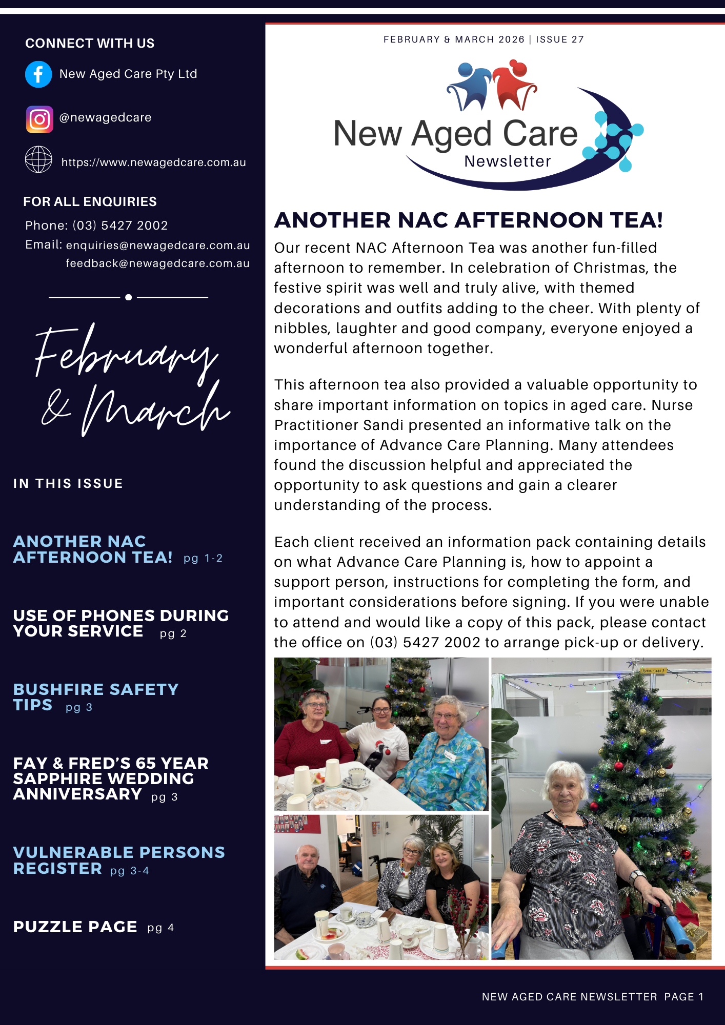 Our February to March newsletter highlights another successful NAC Afternoon Tea, where clients came together to celebrate the festive season, enjoy great company and learn more about important aged care topics. Nurse Practitioner Sandi shared valuable information on Advance Care Planning, with attendees receiving practical resources to support future decision-making.